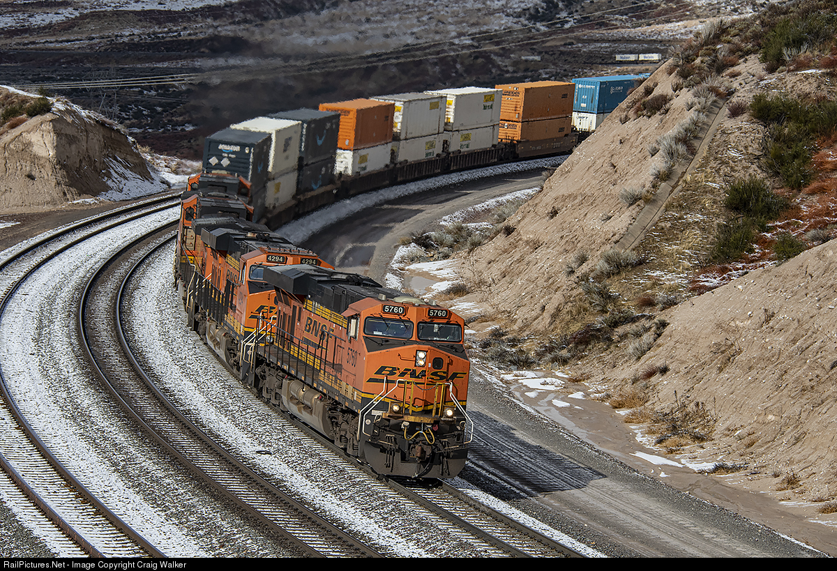 One of Cajon Pass’ iconic locations is the big curve that leads eastbound trains in Summit. Following a snowing night, BNSF Priority UPS-LTL Intermodal train Z-SBDWSP9-25 (San Bernardino CA to Willow Springs IL) is just about done climbing the 2.2% grade as it rounds that curve and will, in a mere few hundred feet, crest the mountain. BNSF owns thousands of modern GE diesels, and a quartet of them (ES44AC 5760, ES44C4 4294, Dash 9-44CW 5088 and ES44C4 4248) are pulling this train. Sadly, the morning’s snow is disappearing quickly. (Cajon Pass, California – January 25, 2021)