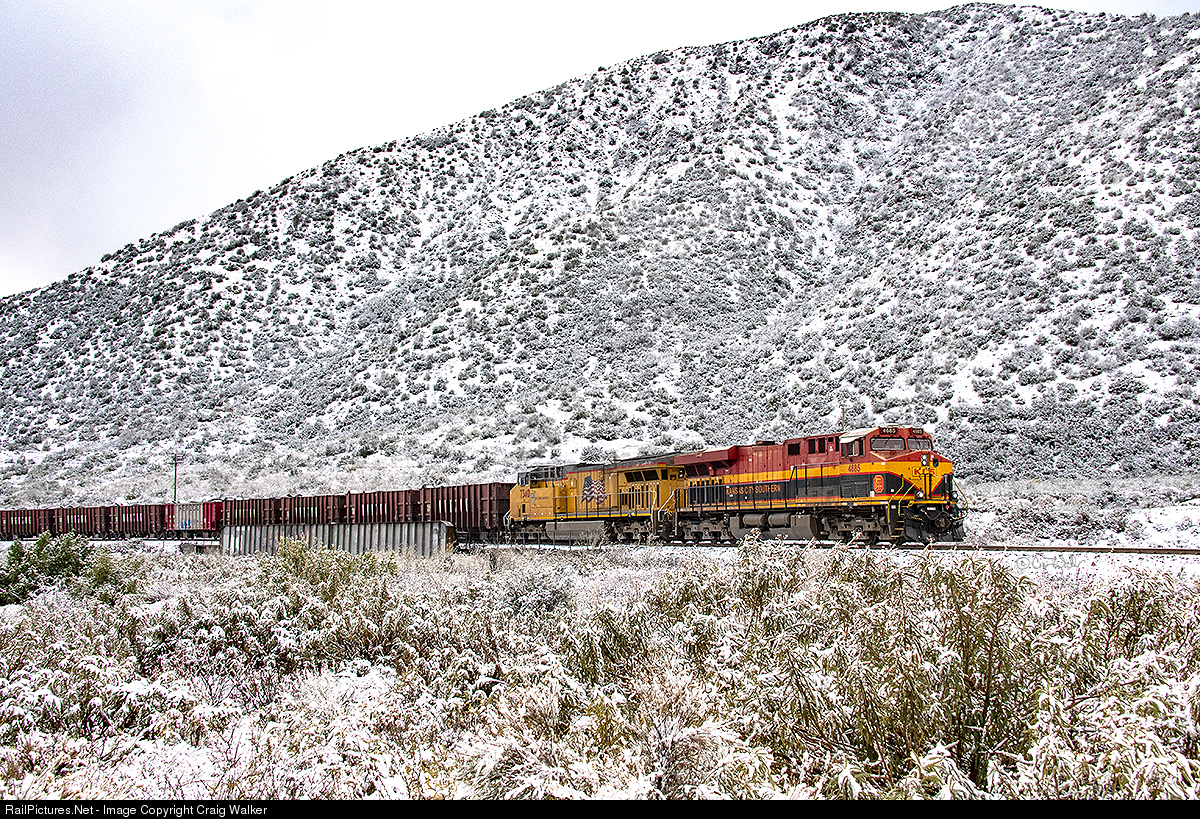 It’s a bit of a cheat, but sometimes the best shot of a train is on the rear, particularly if the Distributed Power Units are facing rearward. Such was the case with Union Pacific train WELYUZ-20, a work train consisting of Herzog ballast cars that originated in Elsey CA and is headed to Yuma, Arizona, approaching the Canyon Siding near the landmark Mormon Rocks on a snowy morning. Bringing up the rear are two DPUs, UP AC6000CW 7640 and Kansas City Southern ES44AC 4685, looking a bit faded but still a welcome sight in its "Retro Belle" colors. (Cajon Pass, California – January 25, 2021)
