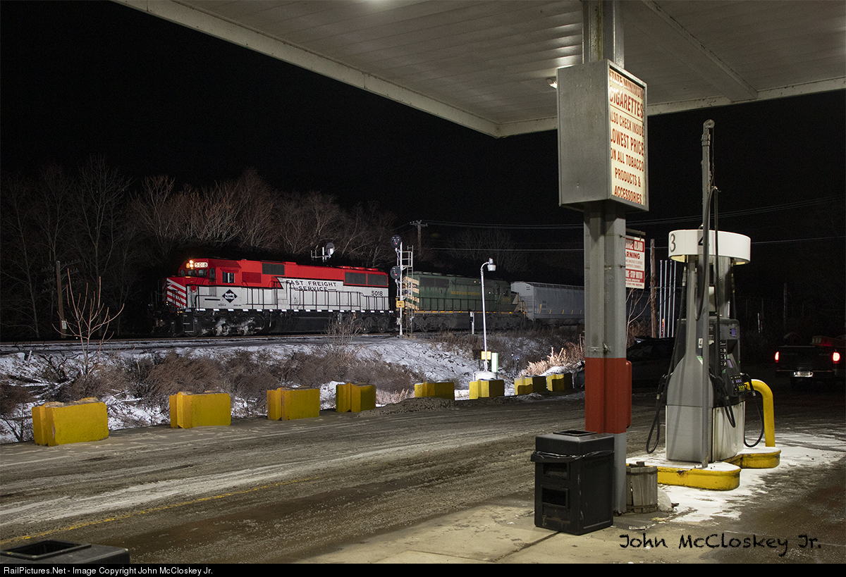 The Reading & Northern's premier train, the NRFF, is seen stopped on the approach into Pittston Yard with one of the railroad's new "Fast Freight" painted SD50's on the point.