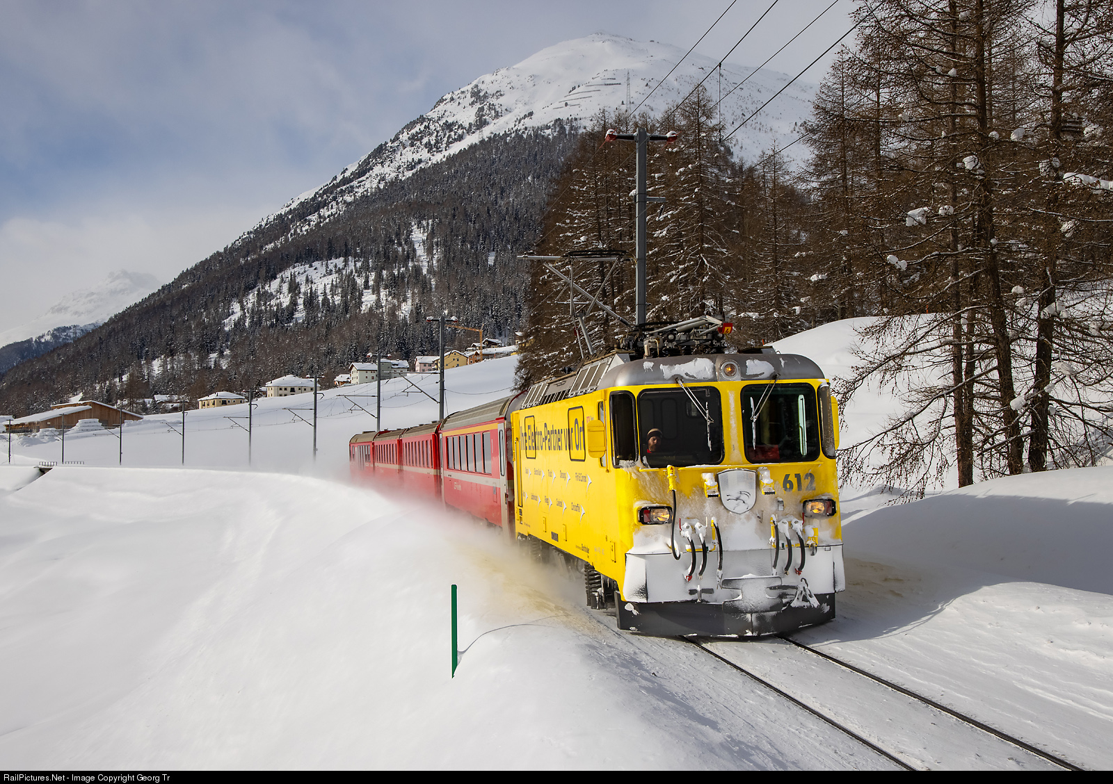 | Ge 4/4 II # 612 of the Rhaetian Railway, in the new yellow publicity paint scheme for the Burkhalter group (The Burkhalter Group is Switzerland’s leading one-stop provider of electrical engineering services to the construction sector. They currently have 47 group companies at more than 100 locations throughout the country, staffed by some 3000 employees including around 650 apprentices), is pulling the push-pull regional train R 1936 from Pontresina to Scuol-Tarasp, between La Punt-Chamues-ch and Madulain. |