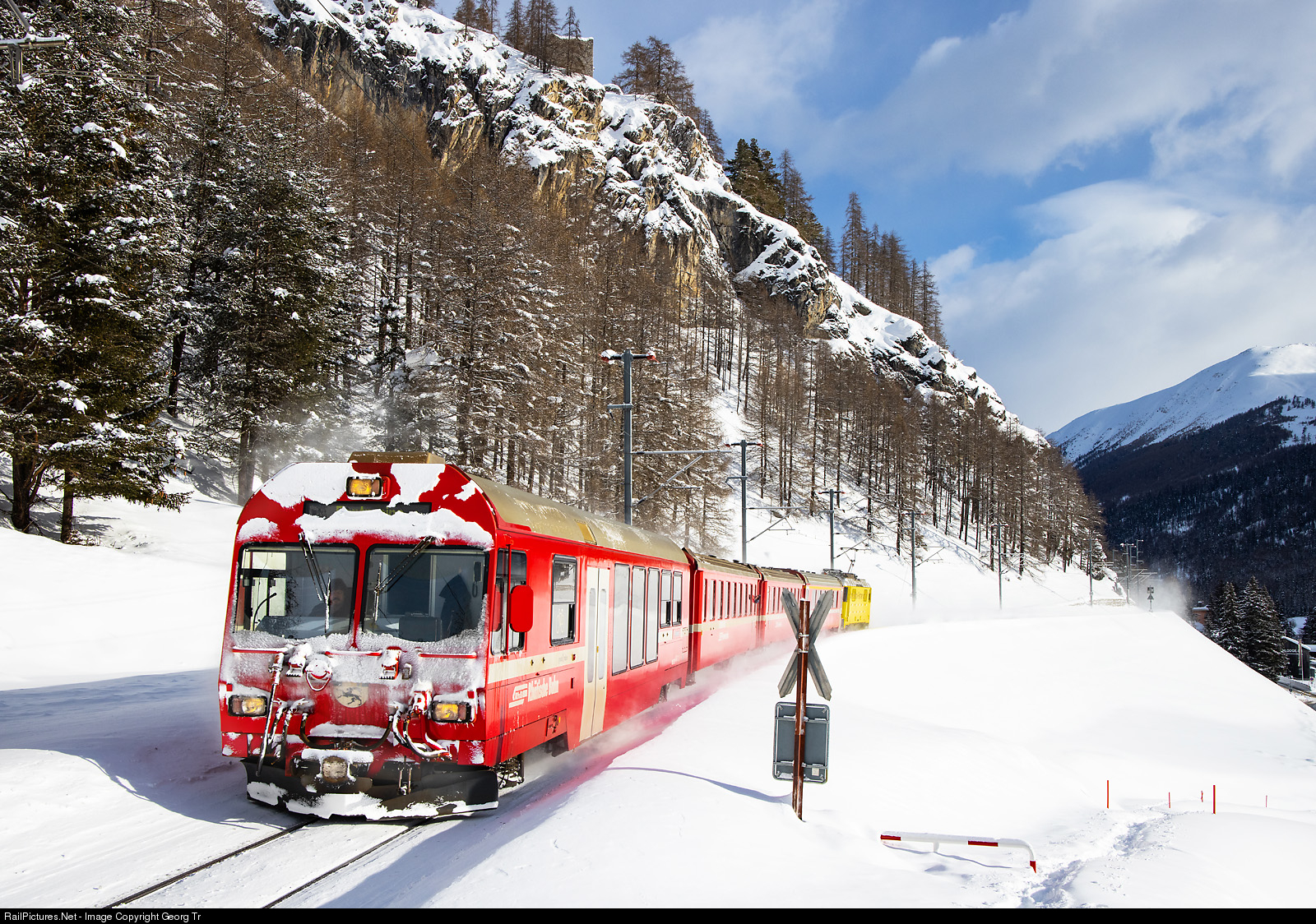 | Regional train 1925 of the Rhaetian Railway from Scuol-Tarasp to Pontresina, between Madulain and La Punt-Chamues-ch, with leading NEVA cab car BDt # 1757 and Ge 4/4 II # 612 "Burkhalter Group" shoving in the rear. |