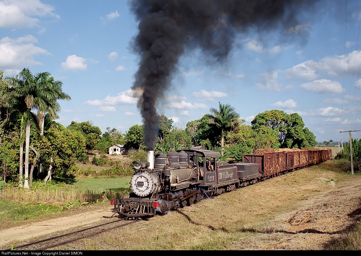 | Back in the year 2000, the Central Mal Tiempo had a classic all-steam narrow gauge operation (30"). In the late afternoon, #1320 (a 1909 Baldwin) is steaming back to the mill with a loaded cane train. |