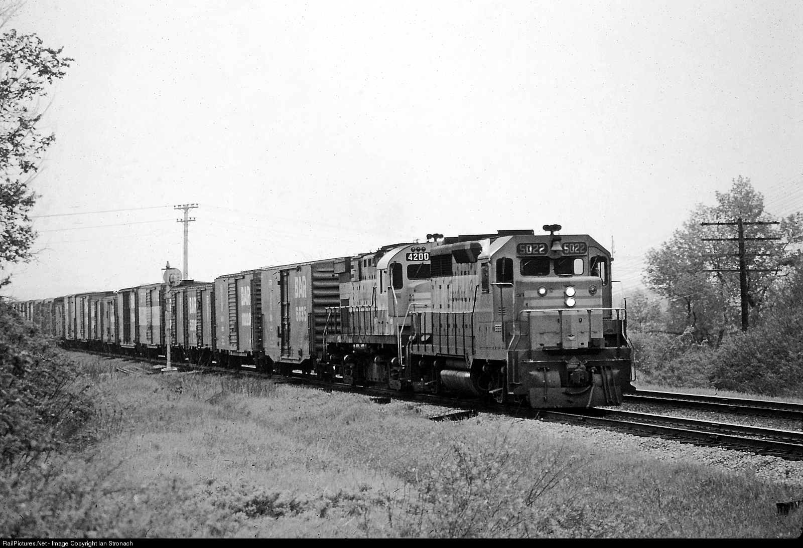 A westbound freight headed for Smiths Falls starts its climb up Vaudreuil Hill. The second unit, CP 4200 built in 1963, was the first Century 424 and the first, second generation locomotive built by Montreal Locomotive Works.
