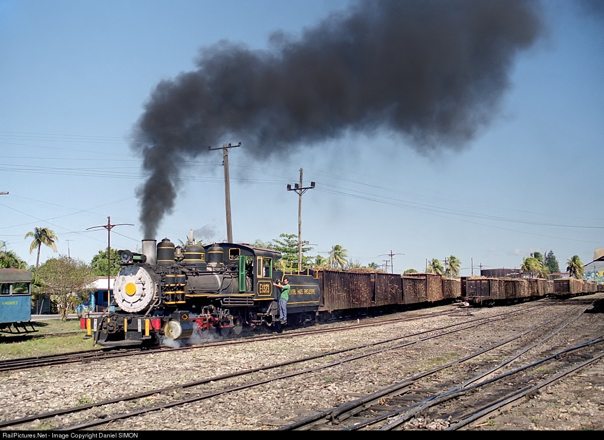 | Hermanos Ameijeiras was the last big 3-foot operation in Cuba that still had active steam in the year 2000, although most of the work was handled by five British made Brush diesel locomotives. #1373, a nicely painted Baldwin from 1925 is shunting a rake of loaded wagons in the yard. |