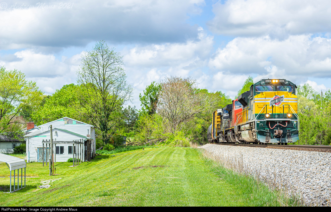 | Back when foreign power was more common and some really interesting lashups could make their way through, Union Pacific's Chicago & Northwestern heritage unit leads a CN GE and a NS D9-44CW as it takes manifest NS 188 east towards Crewe. |