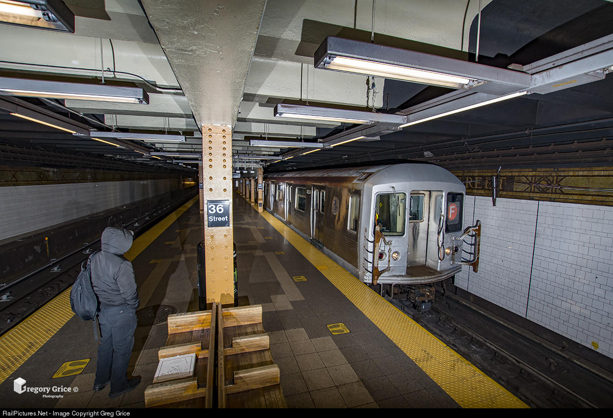 "R42 Transfer at 36th" A confused New Yorker looks on as a New York City Transit transfer move, led by St. Louis Car Company R42 #4834, passes by 36th Street station on the BMT Fourth Avenue Line in Brooklyn, NY. This January 29th, 2021 move consisted of eight R42s and was enroute to Coney Island Yard to drop of a portion of it's train before heading back to storage at Fresh Pond Yard on the Myrtle Avenue Line in Queens. The R42s entered service in 1969 and ran in passenger service up until February of 2020. Most were scrapped between 2007 and 2009 with the arrival of the R160 cars leaving 50 cars running mainly on the BMT Jamaica Line until the R179s were secured in service. Since then, a handful were put into work service with a few others stored until further notice.