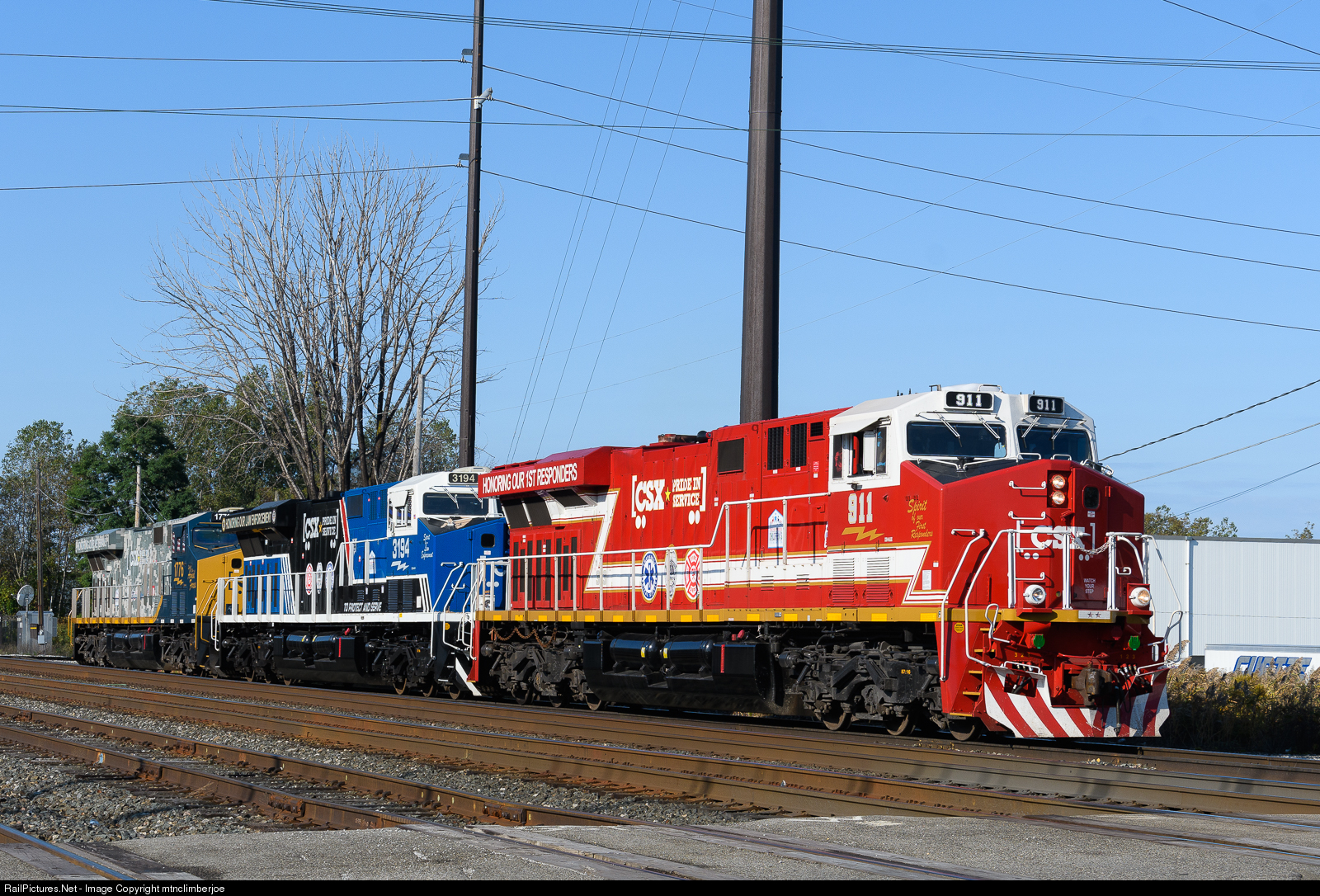 CSX's three "Pride In Service" tribute locomotives make a short trip east through the yard in Erie, Pennsylvania under the control of the Y120 crew. The locomotives are bound for the Wabtec/GE Plant, where they will spend a few days before moving to the Lake Shore Railway Museum for a public display.