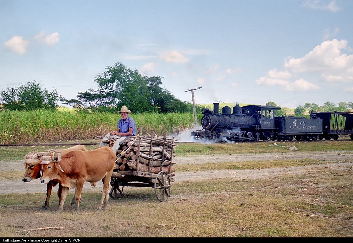 Deep in the Cuban countryside, the most widely used means of transport are horses and ox carts for heavier loads. This peasant returns home with a cart loaded with firewood. Meanwhile, # 1387 (a Baldwin from 1905) is shunting empty cars at a loading point.