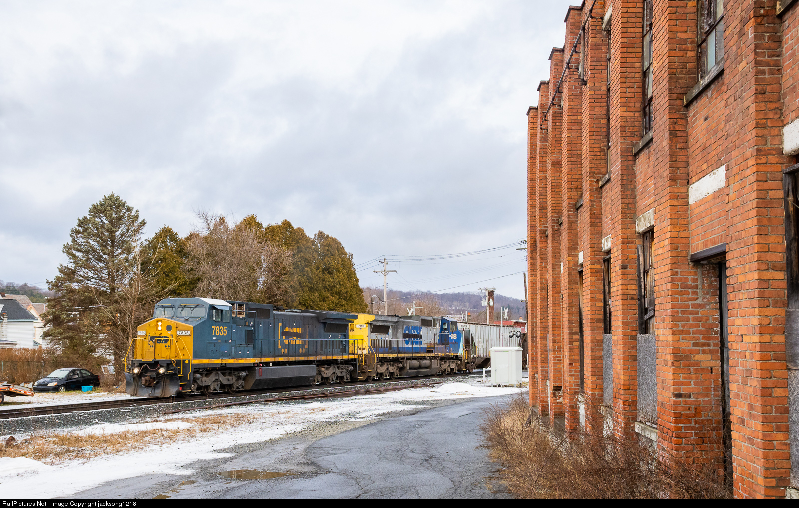 Pan Am train RJED (Rotterdam Jct, NY - East Deerfield, MA) passes an abandoned brick warehouse in the town of Hoosick Falls, NY with a pair of ex CSX GE C40-8Ws for power.