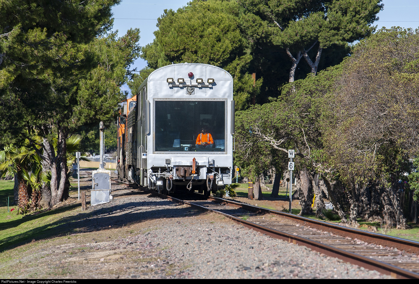 The BNSF GEO train (geometry train) shoves south from El Segundo with a picture window leading the way over Monoco Hill.