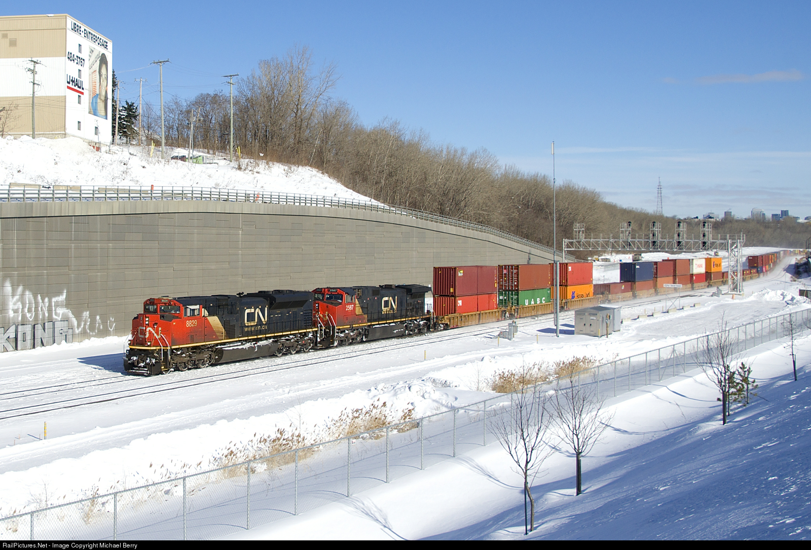 | Due to a derailment of CN 306 in New Brunswick, CN 121 is into Montreal much later than usual as it passes Turcot Ouest. This short edition of 121 (266 axles) has CN 8829 and CN 2587 up front and CN 2673 on the tail end. |