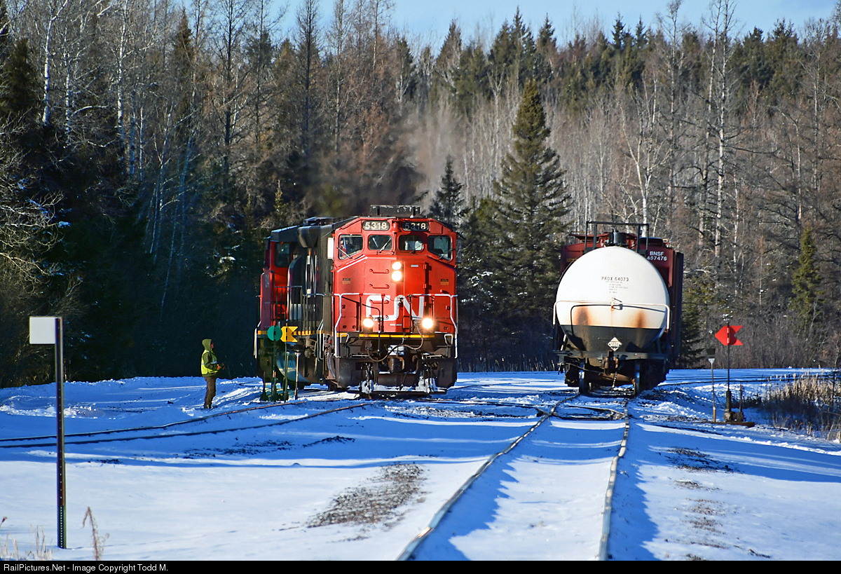 | Light power from Two Harbors is at Wales Jct. to flip their train consisting of the one tank car and three empty bentonite hoppers. When all is said and done the tank car will trail for the ride over to Keenan yard. This is the interchange traffic from North Shore Mining that uses the Wales branch as access between the mine and CN. |