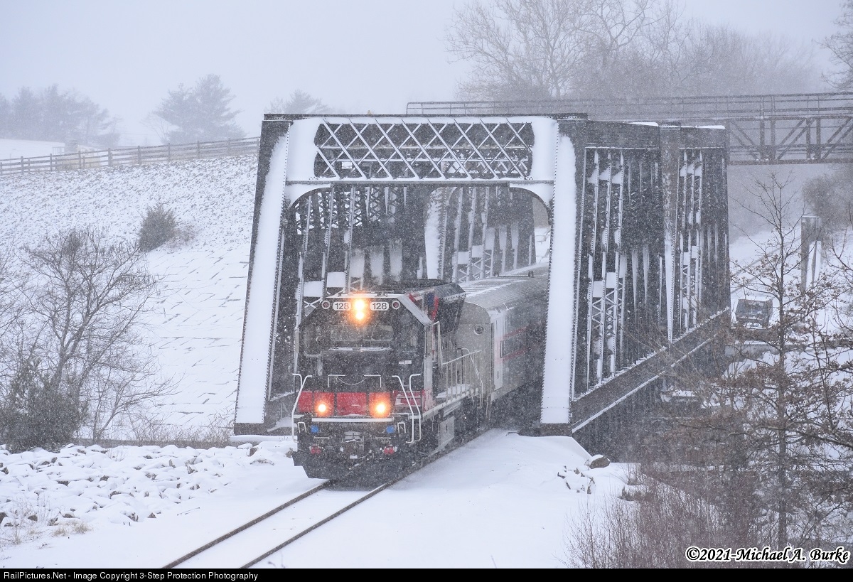 | Light snow is falling as the first northbound of the morning, the 8:03am into Ansonia station, crosses the Naugatuck River. This train to Waterbury starts its journey in Bridgeport as train 3904. Its connection 6504 departs Grand Central Terminal at 5:30am. |