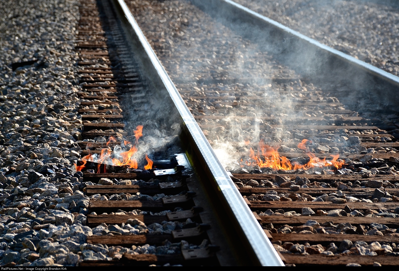 | There's always a possibility of a fire during rail grinding. A crossstie has ignited from the hot metal shavings from a Loram rail grinder. The grinders have water for this exact reason but apparently it caught fire long after it was gone... I reported this, and around thirty minutes or so someone came to extinguish it. |