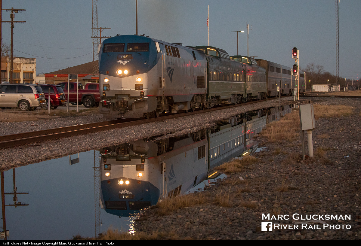 Reflecting On A Long Journey. Amtrak 21 (Texas Eagle) pulls into the station in Taylor Texas on Saturday, January 2, 2021. Amtrak 146 (P42DC) leads both Webb Rail's former Northern Pacific Railway Budd built Pullman dome/sleeper 313 (WEBX 801044) and former Northern Pacific Railway Budd built dome/coach 549 (WEBX 801045) as it passes a well placed reflecting, highlighting the low light of a evening.