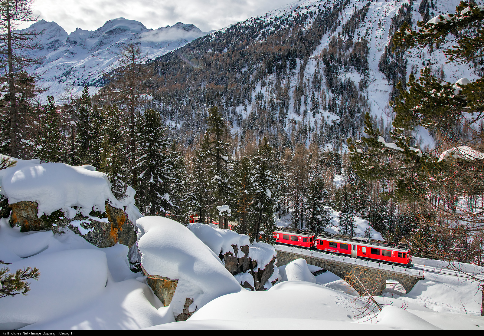 | Railcars ABe 4/4 # 53 and # 51 of the Rhaetian Railway in multiple control are pulling the regional train 1633 from St.Moritz to Tirano over the Ova da Bernina bridge between Morteratsch and Bernina Suot. Rather much snow in the moment. In the background is 4048 meter high Piz Bernina, highest mountain in Grisons, and Piz Morteratsch. |