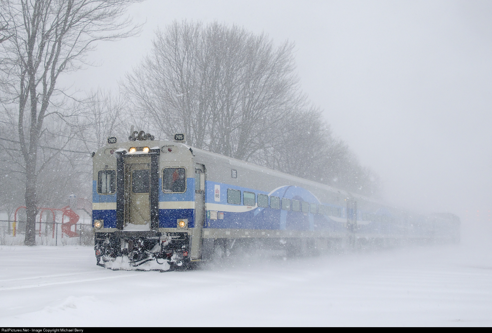 EXO 79 is seconds away from its stop at Montreal West Station as cab car AMT 705 leads during a fierce snowstorm. AMT 1328 is shoving at the other end.