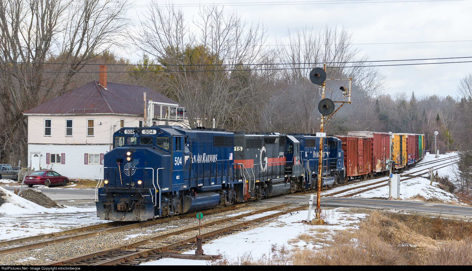 Pan Am Railway's RUPO comes off of the Rumford Branch and on to the main line at Leeds Junction, Maine. A set of defunct searchlight signals stand guard as the train of paper boxcars roll past and head west.