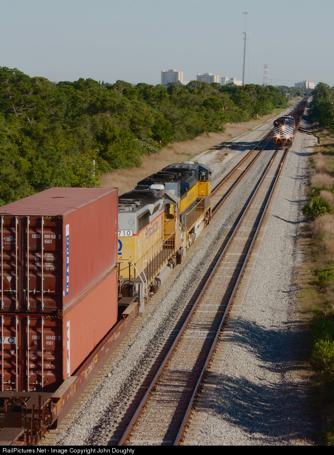 FEC 102 and FEC 710 lead the northbound train 210 down the siding in Palm Bay to meet the southbound counterpart train 109.