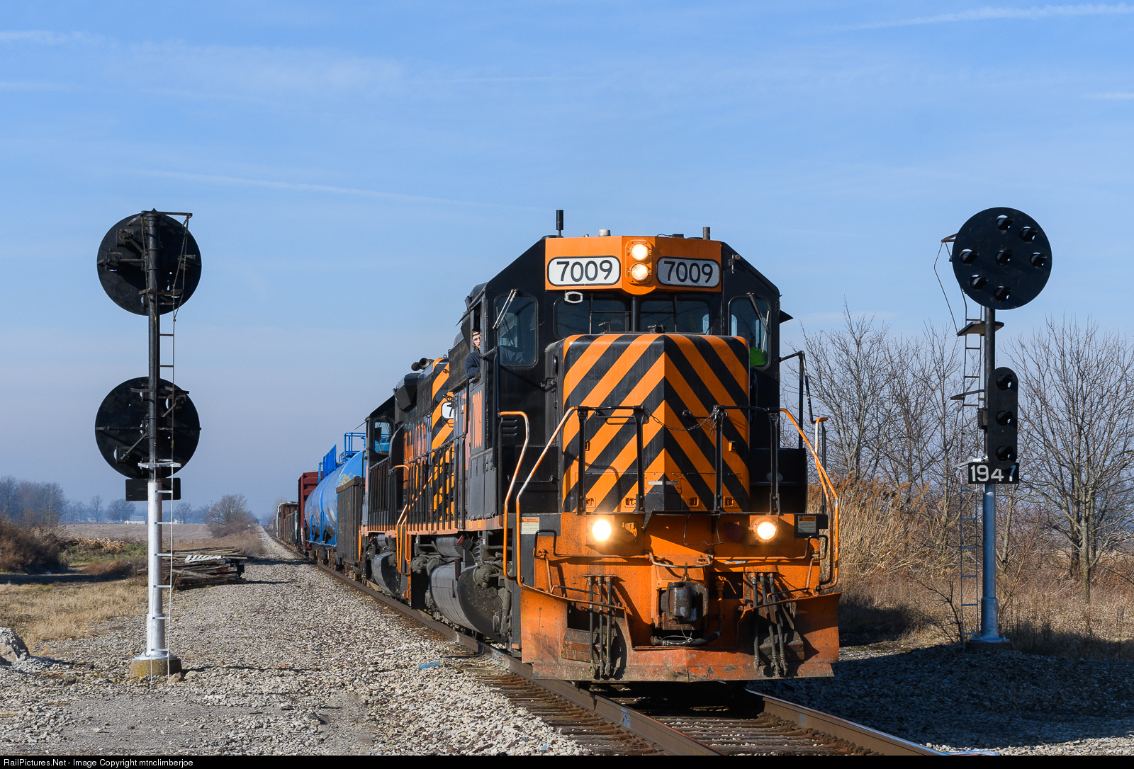 Wheeling & Lake Erie 430 splits a pair of PRR position light signals as it cruises east through North Robinson, Ohio over the CF&E.