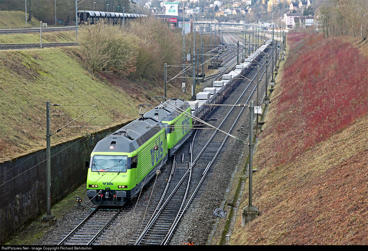 | BLS Cargo Re 465 011 and 012 in multiple control are refit locomotives with the new paint scheme. They are pulling a train (Uckange, France -) Basel – Singen (Germany), loaded with aluminium. |