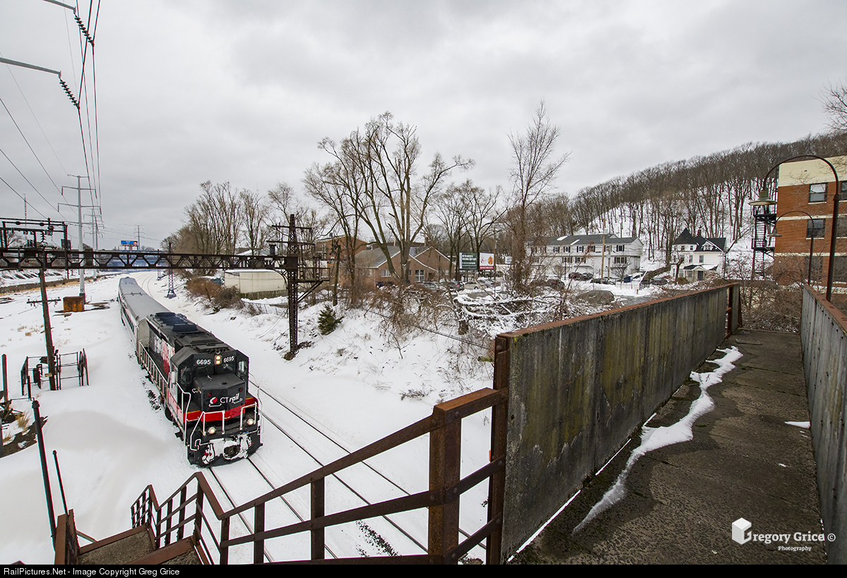 Northbound CTrail train 4406 passes the old New York, New Haven & Hartford Railroad Cedar Hill YMCA overpass on Amtrak's MRS Line in New Haven, Connecticut on February 2nd, 2021 after the passing of a major snow storm.