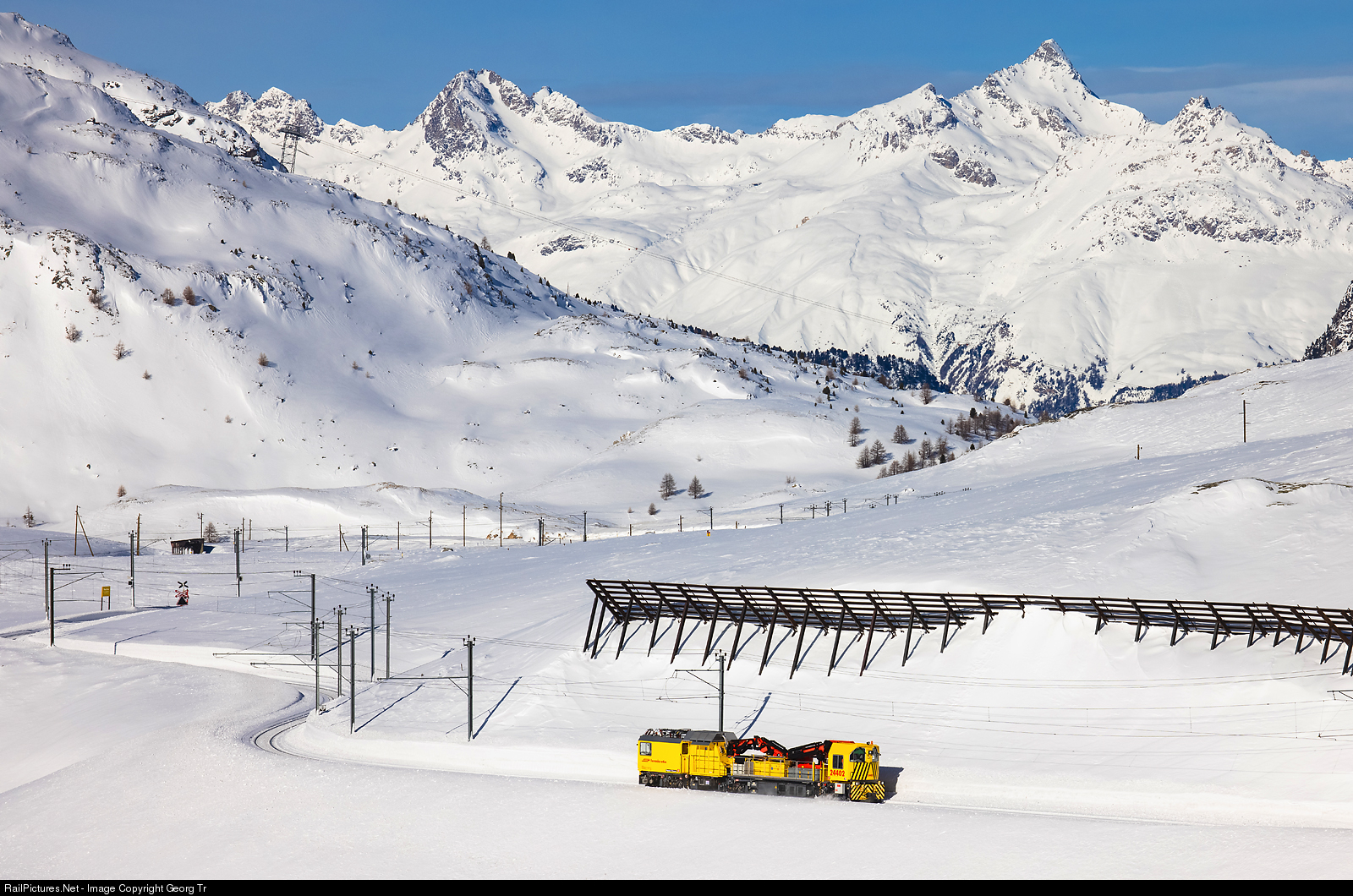 Self propelled diesel powered articulated sixaxle overhead wire maintenance and repair vehicle Xmf 6/6 # 24402 of the Rhaetian Railway is curving over the Bernina line along the Lago Bianco on about 2250 meter a.s.l., with Piz Saluver and Piz Ot (3246 m) in the background, north of the Engadine. This MTW 100.160 overhead wire maintenance vehicle with 2 x 395 kW was delivered by Plasser and Theurer/Austria in 2016, has a weight of 75 ton and a maximum velocity of 90 km/h. The vehicle has a pantograph for control purpose only.