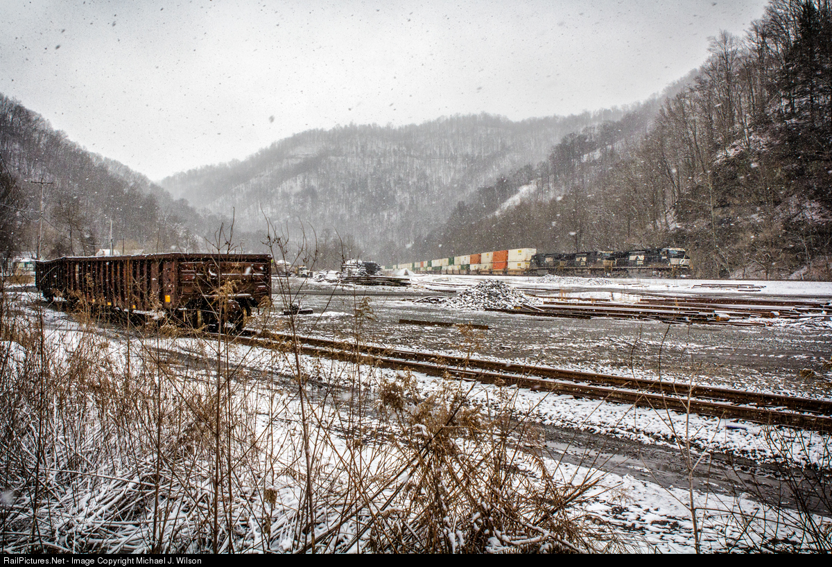 | Norfolk Southern Dash 9-44CW #9889 bypasses the sleepy railyard near Kimball, WV on January 28, 2021 with its intermodal train deep in the mountains of southern West Virginia. |