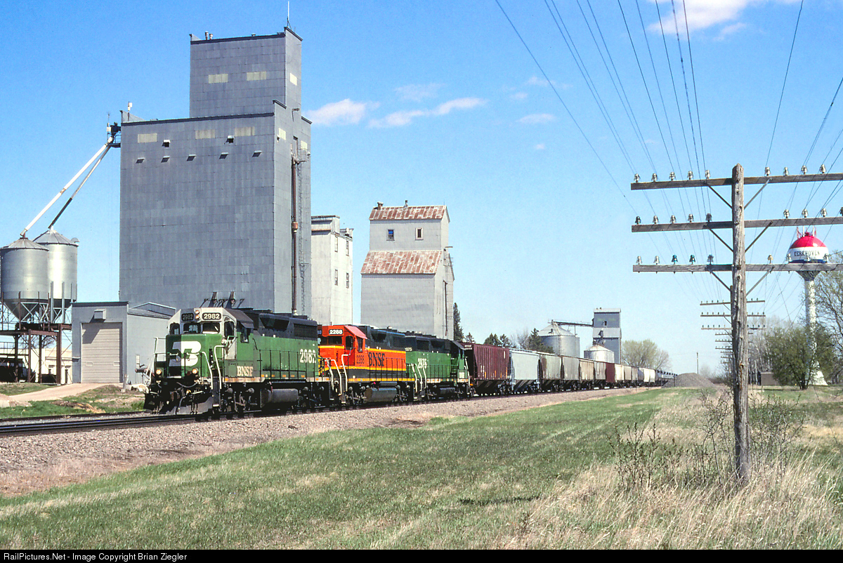 | Code lines for CTC from the Great Northern Railway days still stand and are in use as this westbound passes the elevators in town. This was one of the last areas in Minnesota on the BNSF to have PTC installed and since then all the code lines have been removed. |