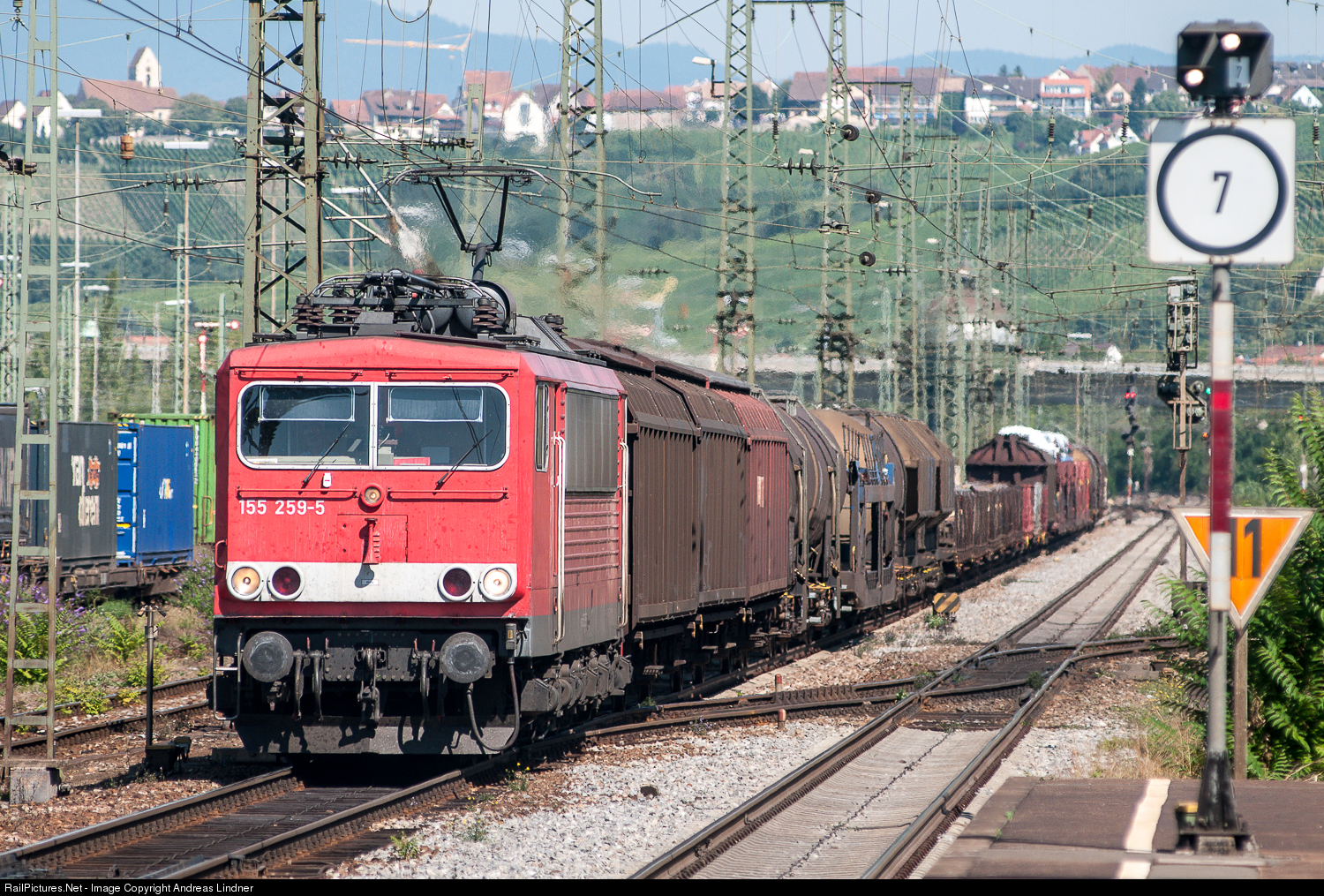 | The engine driver of 155 259-5 put on the brakes. The braking resistors emit the heat through the roof, and the following cars seem to be pushing themselves onto the locomotive. Originally made in the GDR, the 155 259-5 was on the rail far from its former home. Only a few kilometers separated it from the border to Switzerland. |