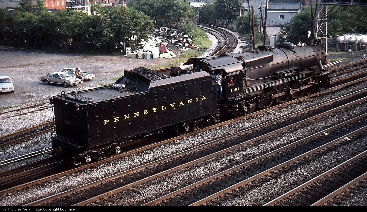 PRR K4s No. 1361 (Juniata, 1918) in a back-up move, giving us a good view of its 130P75 tender. (13,000 gallons, Passenger service, 75" high firing deck; 22 tons of coal.) The track curving off to the left is the Hollidaysburg Branch.
