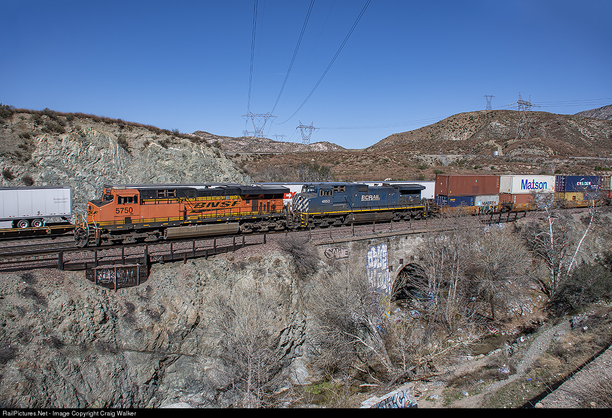 After a series of stops due to issues with the locomotives’ Positive Train Control (PTC) and Trip Optimizer programming, BNSF train Q-NWHLAC6-30 was able to get the systems working all right and the train was able to make track speed from Summit all the way to Los Angeles. BNSF ES44AC 5750 and British Columbia Railway Dash 9-44CW 4653 are leading this intermodal train, which originated in Ohio’s North Baltimore, with BNSF ES44C4 6632 and BNSF ES44AC 6075 (one of the BNSF’s 25th Anniversary engines) on the rear, operating in Distributed Power (DPU) mode. Fifteen miles after the crew got the systems rebooted, the train is finally making good time again as it passes through the Pass’ iconic, but now heavily tagged, Blue Cut. (Cajon Pass, California – February 5, 2021)