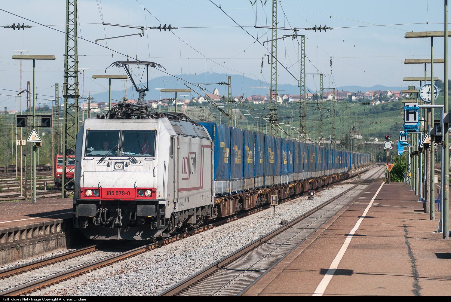 | The Crossrail locomotive 185 579-0 passing through the train station in Weil am Rhein. Less than two kilometers and the train reaches Swiss soil. Only truck-flatbeds and trailers from Lkw-Walter were on the wagons. |