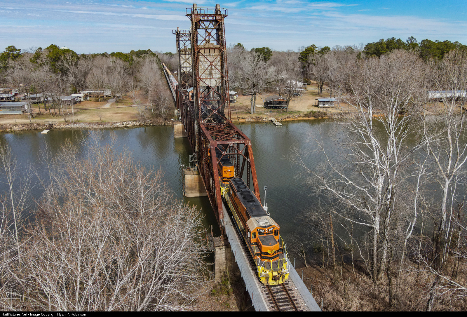 | After the crew activated the self-timer lift bridge over the Black Warrior River, AGR 211 slowly rolls across the river and into the small city of Demopolis. They'll make some headend pickups before continuing on to Linden. The bridge is unique with the self-timer feature because as soon as the train clears the bridge signal mounted directly in front of the bridge, it will go up to resume its position for boat traffic. |