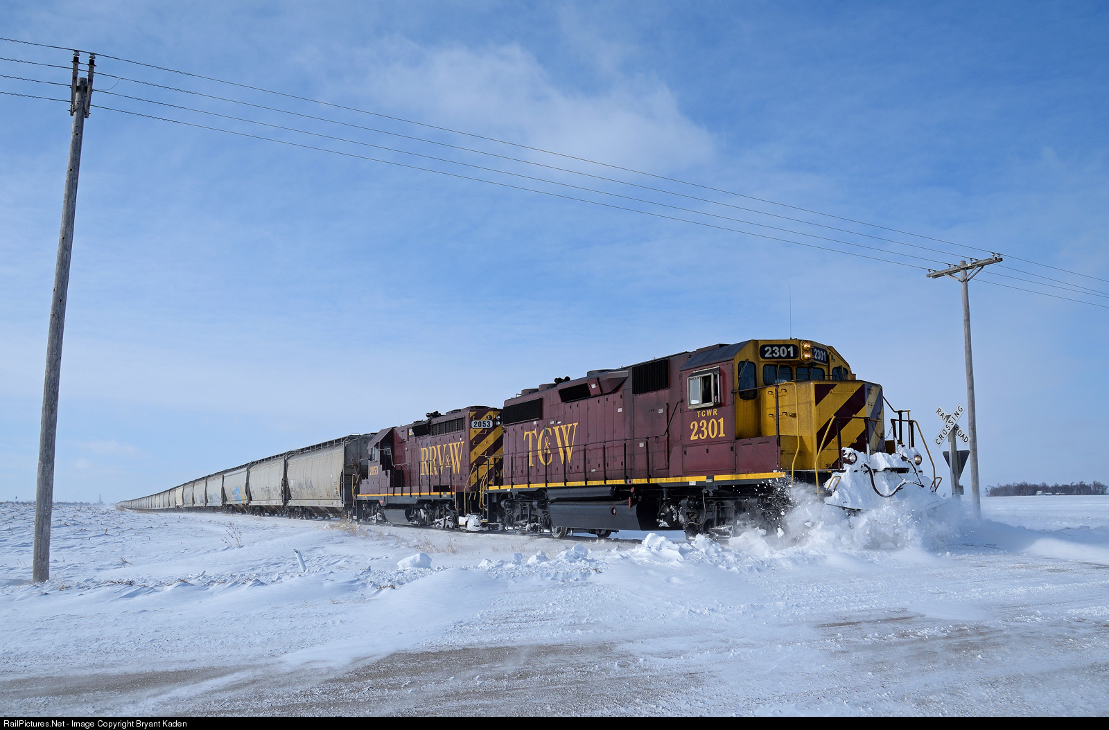 | At 10 mph, the results aren't very dramatic, but it's always fun to see a train break through some plow ridges. An eastbound TC&W train is moving covered hoppers out of storage on this former Minneapolis & St Louis Railway line in west central Minnesota. |
