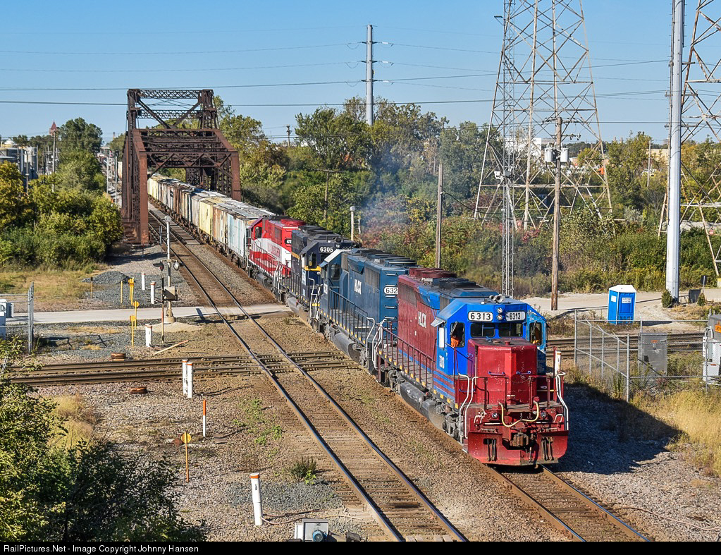 | Normally being a middle of the night run into the Belt Railway Of Chicago’s Clearing Yard, a late and rare daylight WSOR T-004 makes its way south on the BRC Kenton Line and is seen here crossing the Chicago Sanitary & Ship Canal and the BNSF Chillicothe Subdivision at CP Nerska. |