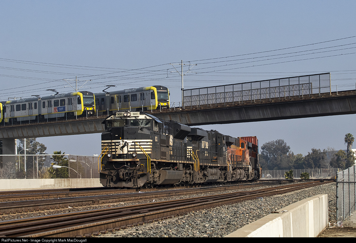 | An inbound S train waits for traffic to clear ahead at Alameda with an NS leader. Meanwhile, a pair of LA Metro A (Blue) Line trains meet overhead. After a bit of a pause, the train will pull to Dolores for a PHL crew to take it to Pier J in the Port of Long Beach. |