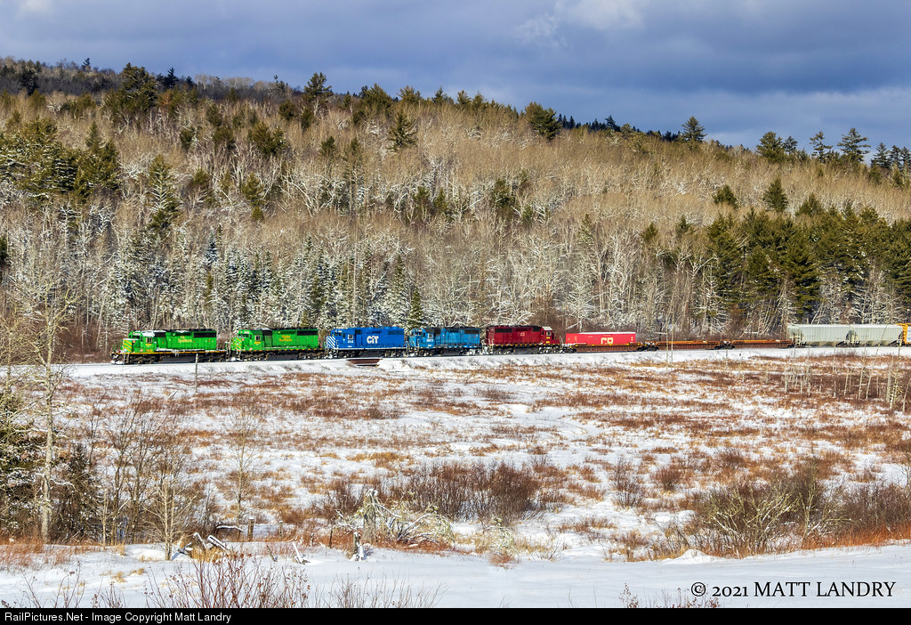 Through the winter countryside, NBSR westbound train 907 has a colorful lashup as they haul their train heading to McAdam and into Maine.