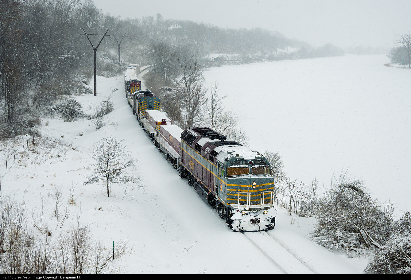 On the cold, snowy morning of Saturday, February 6, 2021, IANR 458 leads CRWA north at Edgewood Rd. along the Cedar River with a large cut of empty flat cars. Their track warrant is between Linn and MP 119, since they are to meet an extra south job at Vinton, IA. The extra job is bringing IANR 76 (Jordan spreader) to plow large drifts on CRANDIC's Amana line.