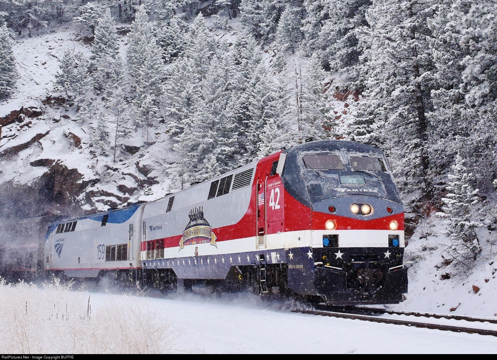 | When the word went out that the California Zephyr was being led by Amtrak #42 in the special Veterans paint scheme, it was decided to head into the mountains to get a tunnel shot. On the day it arrived, Colorado was pounded by an early October snow storm, which made the opportunity that much more special. |
