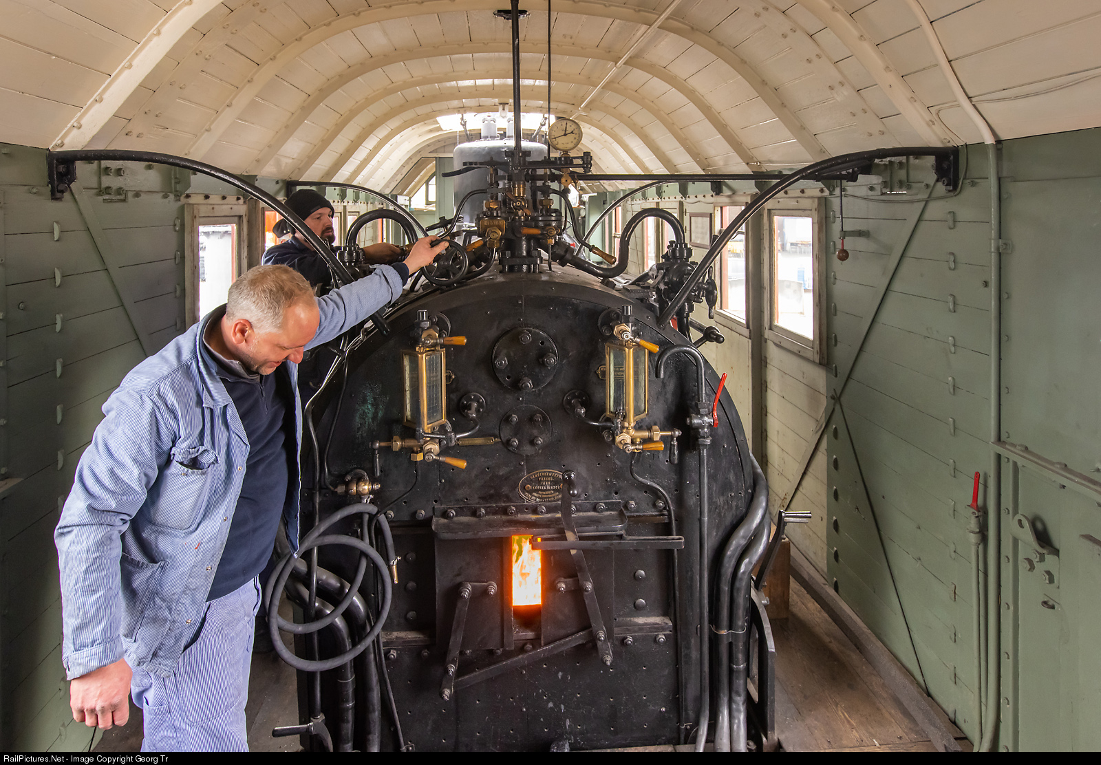 40 years after the steam rotary snow blower Xrot # 100 was retired and exhibited in the Swiss Museum of Transport (VHS) Lucerne, this 125 years old vehicle was steamed up this day in Brugg AG. Work was made by the steam group Zürich (Verein Dampfgruppe Zürich VDZ), initiated and headed by Stefan Landenberger. The Xrot # 100 was built in 1896 by Henschel & Sohn in Cassel/Germany for the Gotthard railway, under licence of Leslie Brothers and has about 800 HP. Fire is burning and steam pressure is slowly rising.