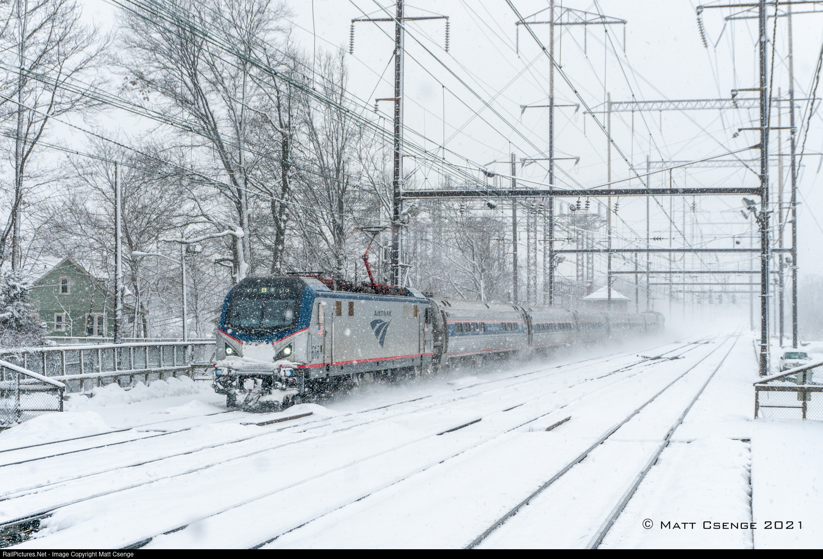 Double-Ended. An eastbound Keystone train races through Metuchen station with an ACS-64 on both ends. Keystone trains change direction at Philadelphia and typically use a cab car on one end, with occasional trains, like this one, having two locomotives.