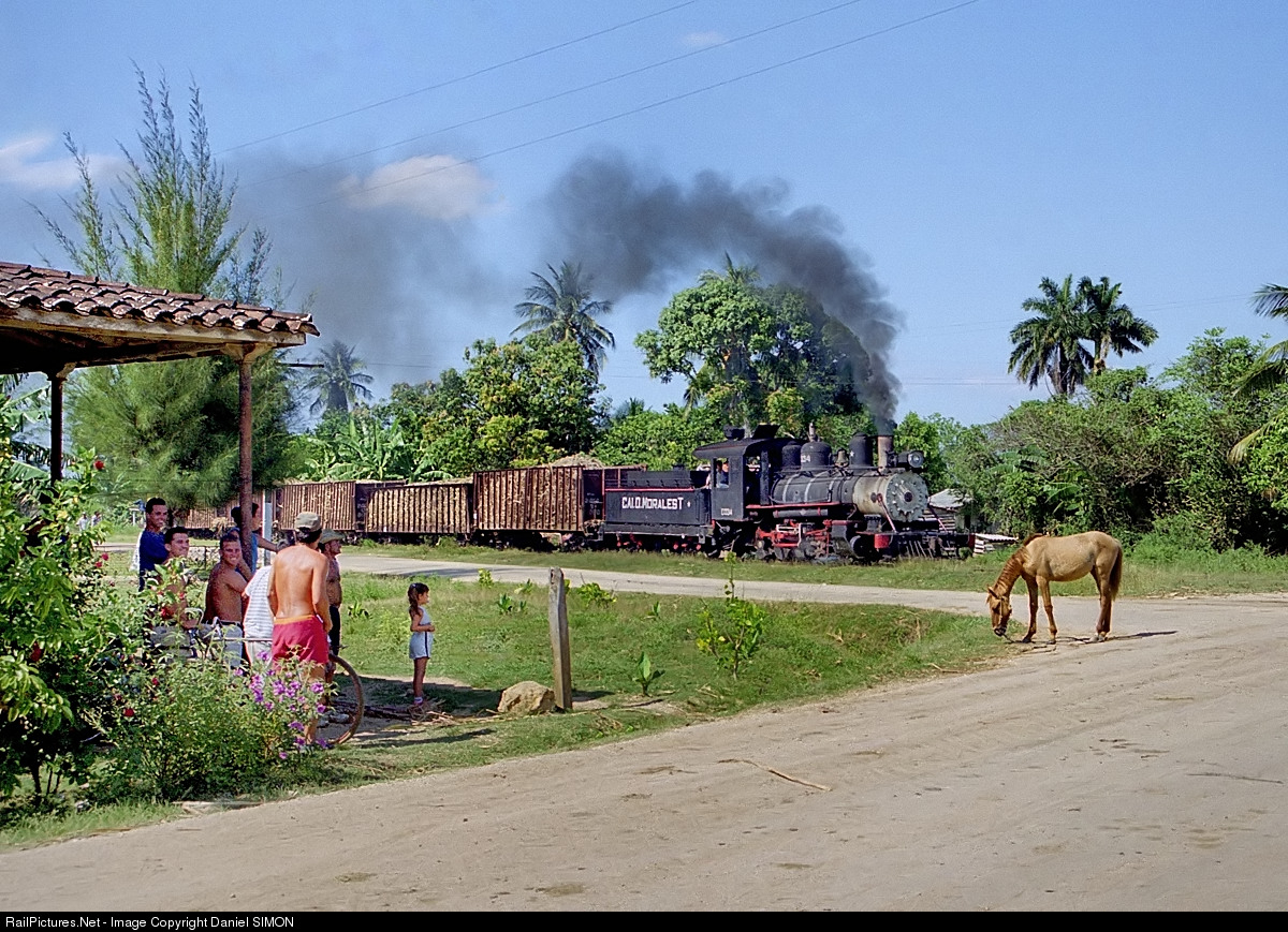 | Built in the 1890's, part of the original Caibarien & Moron mainline was still used by the Obdulio Morales trains to reach several sugar reloads, passing through quaint country villages along the way like this one. The Minaz consolidation #1334 from the Obdulio Morales sugar mill is a 1920 Baldwin. The locomotive was built as Caibarien & Moron Railway #14. |