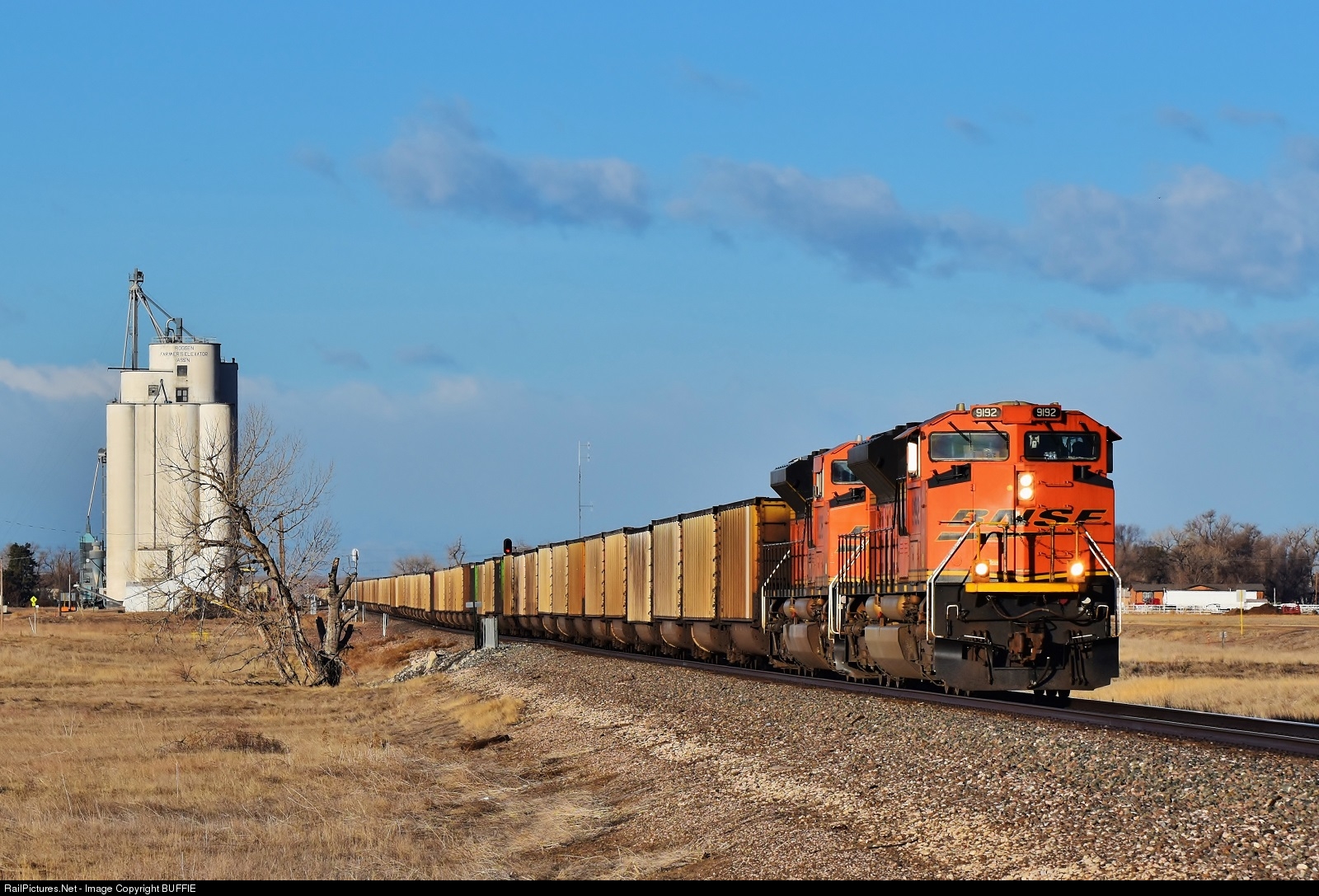 | A BNSF Ace 9192 leads an empty coal train east on the Brush Sub, passing silos as it runs through Roggen, Colorado. |