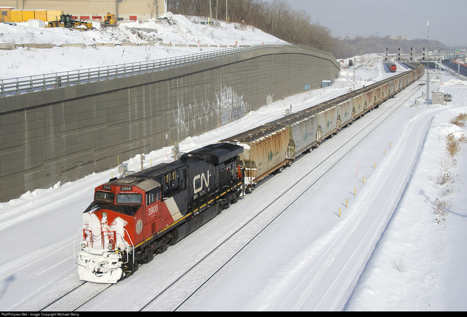 Snow-covered CN 3908 brings up the rear of potash train CN B730 as it leaves Turcot Ouest with a new crew onboard. This 205-car train has CN 3816 and CN 2917 up front and CN 3055 mid-train.