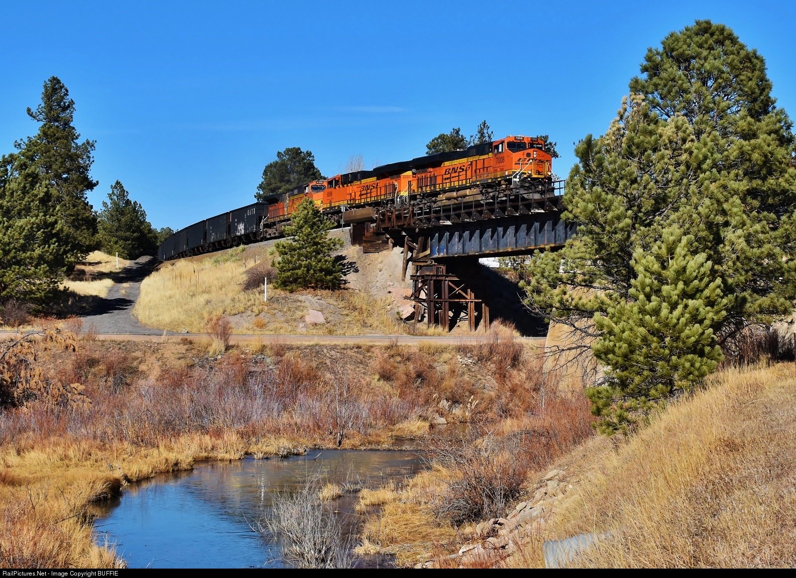 | Some of the most beautiful scenery in Colorado is the area between Sedalia and Palmer Lake, Colorado. Here BNSF 7008 (ES44C4) leads a loaded coal over the Santa Fe Bridge and a creek in Larkspur, Colorado. |