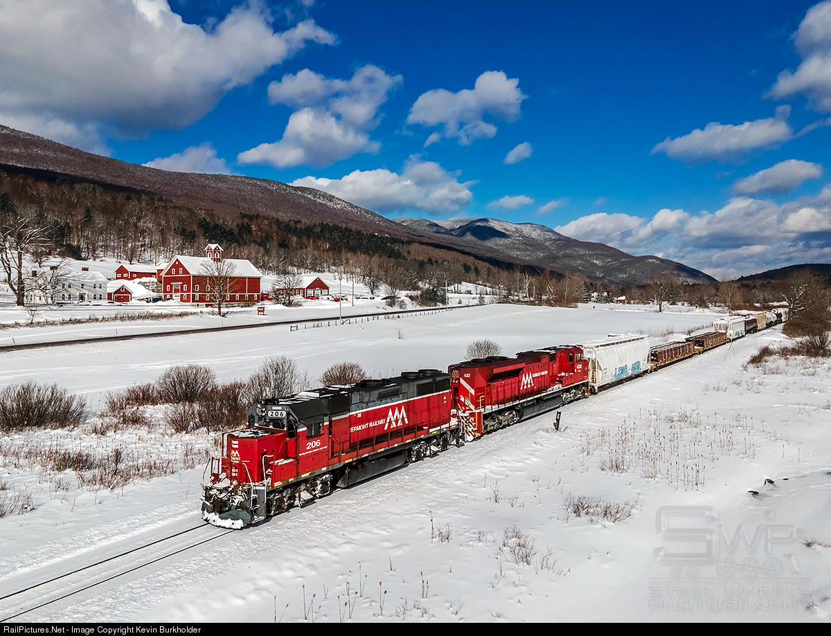 Vermont Rail System's VTR, Rutland to Hoosick Jct., NY, RDHJ-10 train is southbound at East Dorset, VT behind a pair of increasingly more rare company power. VTR GP38-3 206 and SD70M-2 432 lead the 34-car train southbound on a picture perfect winter's morning.