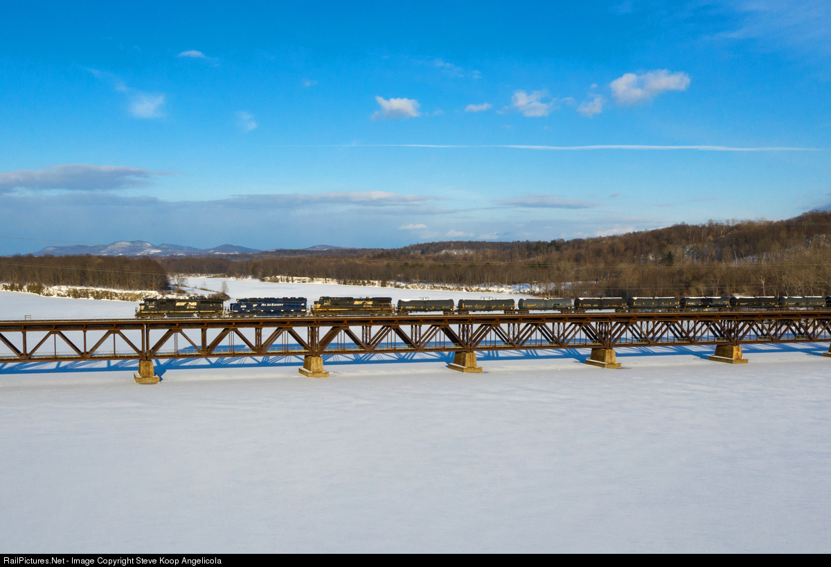 | Pan Am Railway train 11R crosses the Hudson River into Mechanicville. NS 6952, MEC 3405, NS 9853 |