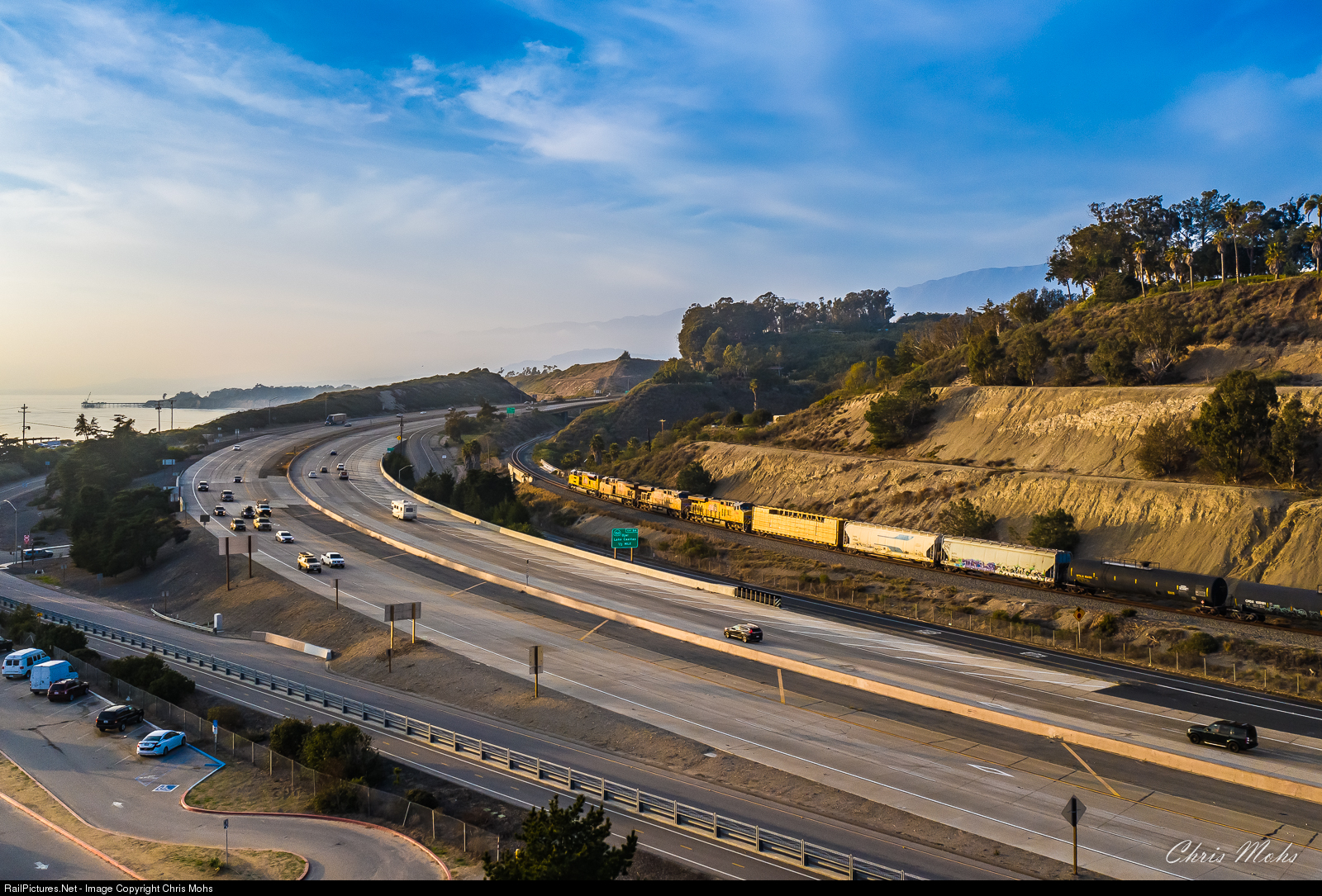 | Northbound Union Pacific no. 3033 leads the Guadalupe Local through Rincon Point in the late afternoon light. The Guad begins the short climb up to the Carpenteria Bluffs passing under Hwy 101 |
