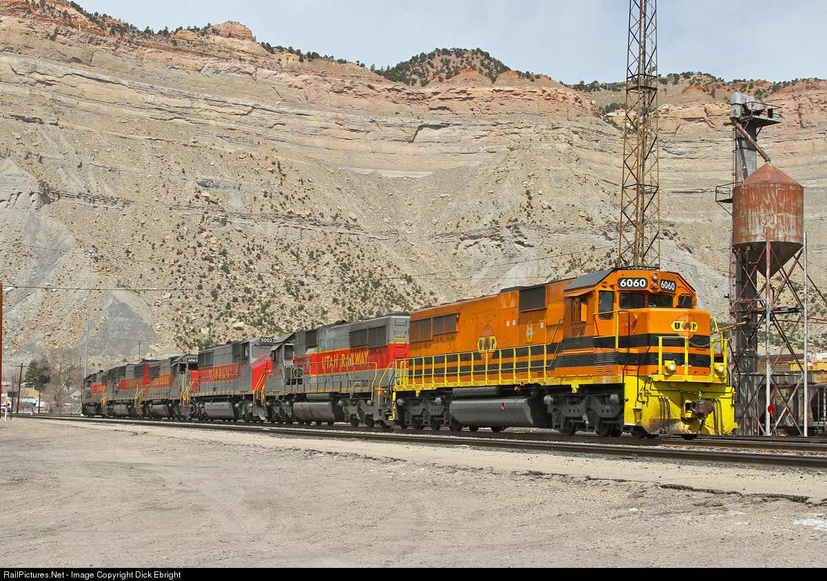 This group of Utah Ry. 6 axle units, led by an Australian built SD50, is rolling east on the ex. D&RGW main line through Helper, Utah. It is headed for the Castle Valley Spur a few miles further east where a loaded, 17,000 ton coal train is waiting. This set of engines will become the manned, mid train, helpers. All this horsepower is needed to lift the coal train up the 2.4% grade in Price River Canyon to Soldier Summit.